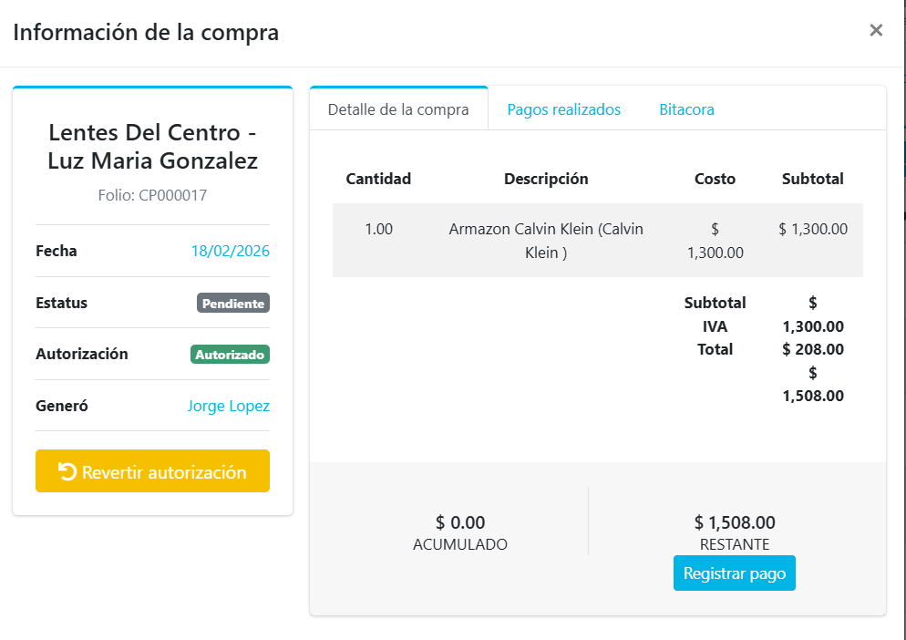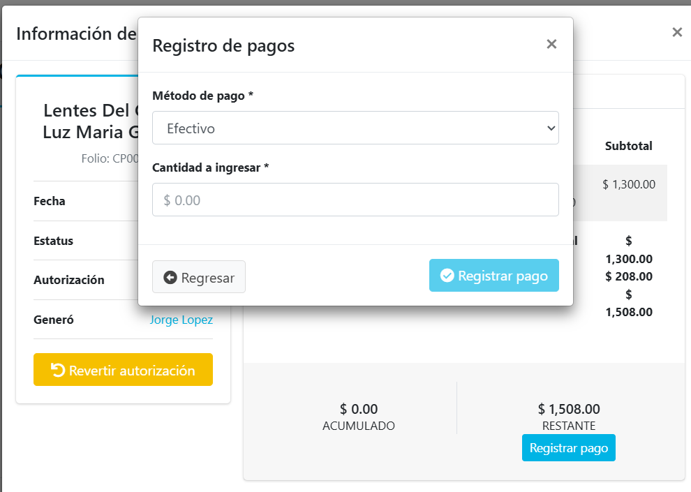El sistema desplegará un formulario dónde pedirá Método de pago y Cantidad a ingresar. Posterior dar clic en Registrar pago para ver reflejado el pago.