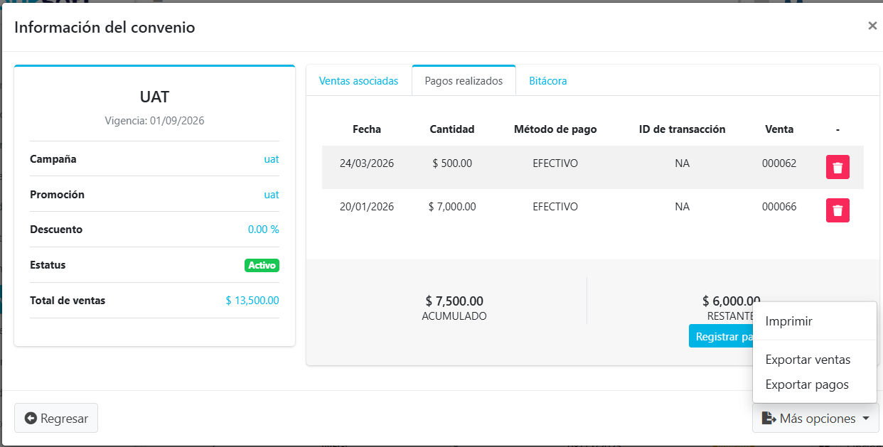 Para imprimir la relación de los pagos, se le tiene que abrir el detalle del convenio que desea imprimir los pagos y darle clic al botón Más opciones y posterior al botón Imprimir en ese mismo apartado se podrán exportar las ventas y los pagos.