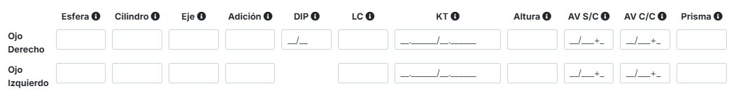 - Examen de la vista. Es la sección que permite introducir los valores del examen de la vista que serán guardados en la base de datos. El sistema está configurado para únicamente aceptar valores válidos, y con ello evitar errores involuntarios.