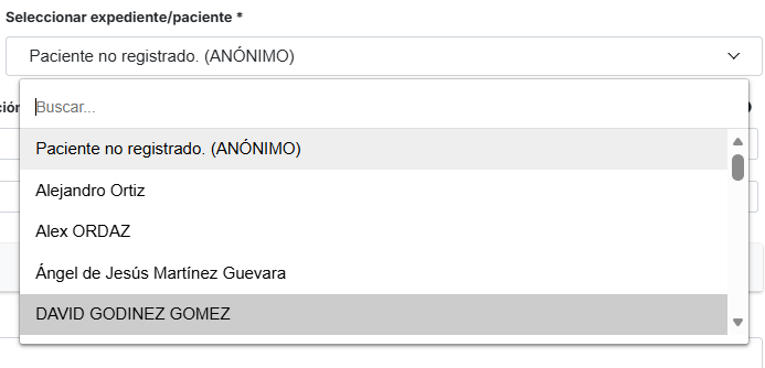 - Selección del paciente. Corresponde a la asignación de la consulta a un paciente registrado en el sistema. Se deberá introducir el código o nombre del paciente y dar clic para seleccionarlo. Existe la opción de Paciente no registrado (mantener ANÓNIMO) para el caso de pacientes nuevos que desean no ser registrados para mantener su privacidad.