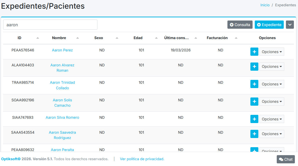 - Buscar al paciente que se le desea realizar la consulta y darle clic al nombre.