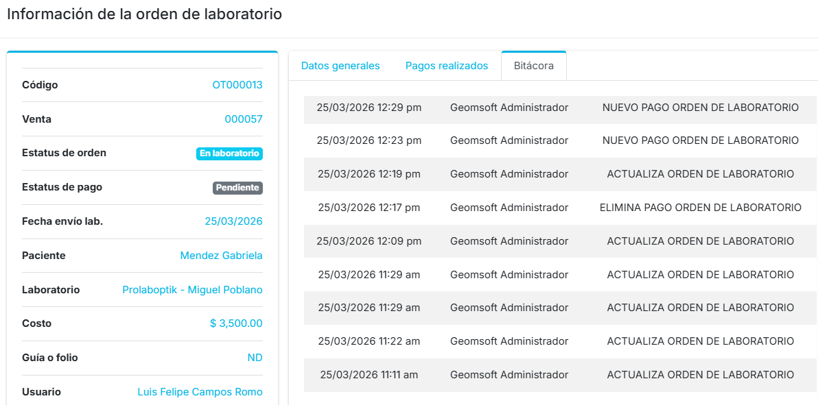 Para consultar los movimientos realizados en una orden deberá ubicar en el listado, el registro que usted desee, luego debe dar clic en el botón de Consultar enseguida diríjase a la pestaña Bitácora. El sistema mostrará un listado con todos los cambios y acciones que se han realizado sobre esa orden.