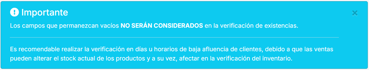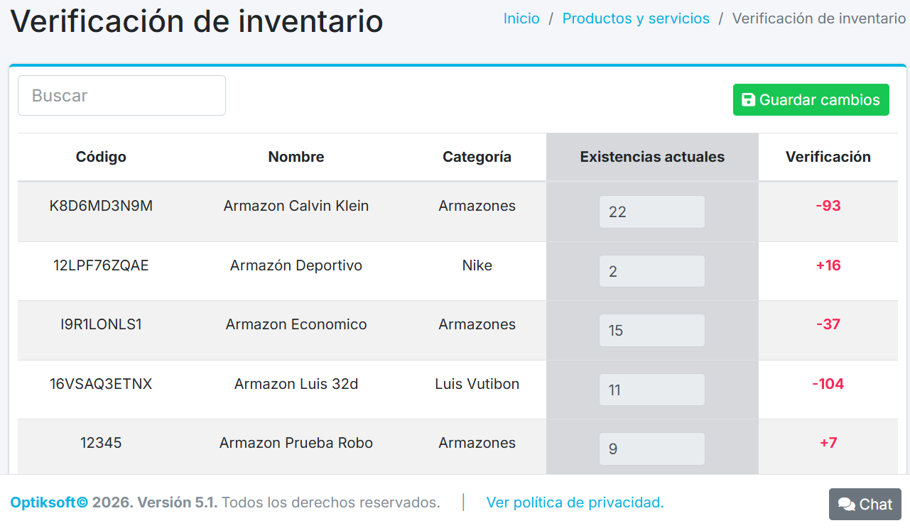 El sistema colocará en la columna de la verificación los números en rojo si hay una variación y si aparece una ✓ es porque el inventario coincide. Al dar clic en Guardar cambios actualizará en automático el inventario con las existencias actuales.