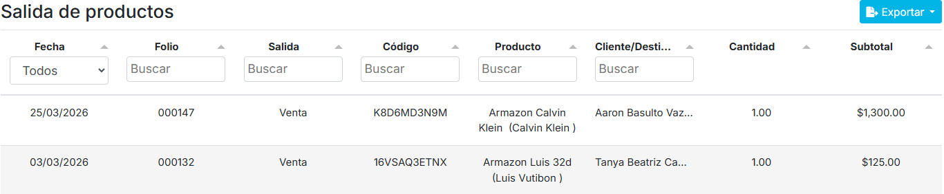 Este reporte puede exportarse en formato CSV, Excel o PDF mediante el botón Exportar.
