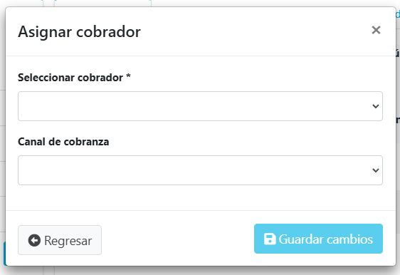 El sistema desplegará un formulario donde tiene que seleccionar el cobrador que esté registrado en el sistema, y también se tiene que seleccionar el canal de cobranza. Al finalizar dar clic en el botón de Guardar cambios.