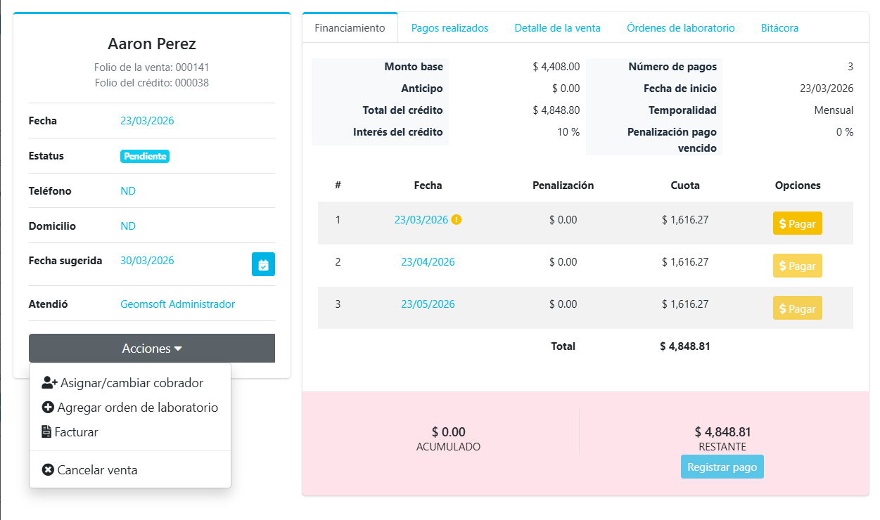 Para asignarle un crédito a un cobrador, se le tiene que dar clic en el botón Consultar . Después dar clic al botón Acciones y a Asignar/Cambiar cobrador.