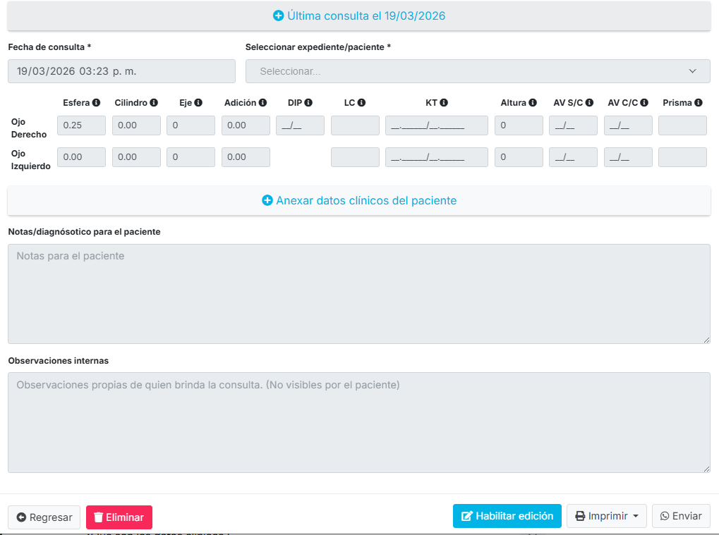 Para modificar una consulta, primero deberá colocarse en el módulo de Expedientes y seleccionar el paciente al cual se le editará la consulta. Después seleccionar la opción Historial de consultas. Posteriormente deberá seleccionar la consulta dando clic al botón y después a Habilitar edición. El sistema desplegará el formato de la consulta. Al finalizar deberá dar clic en el botón Guardar cambios.