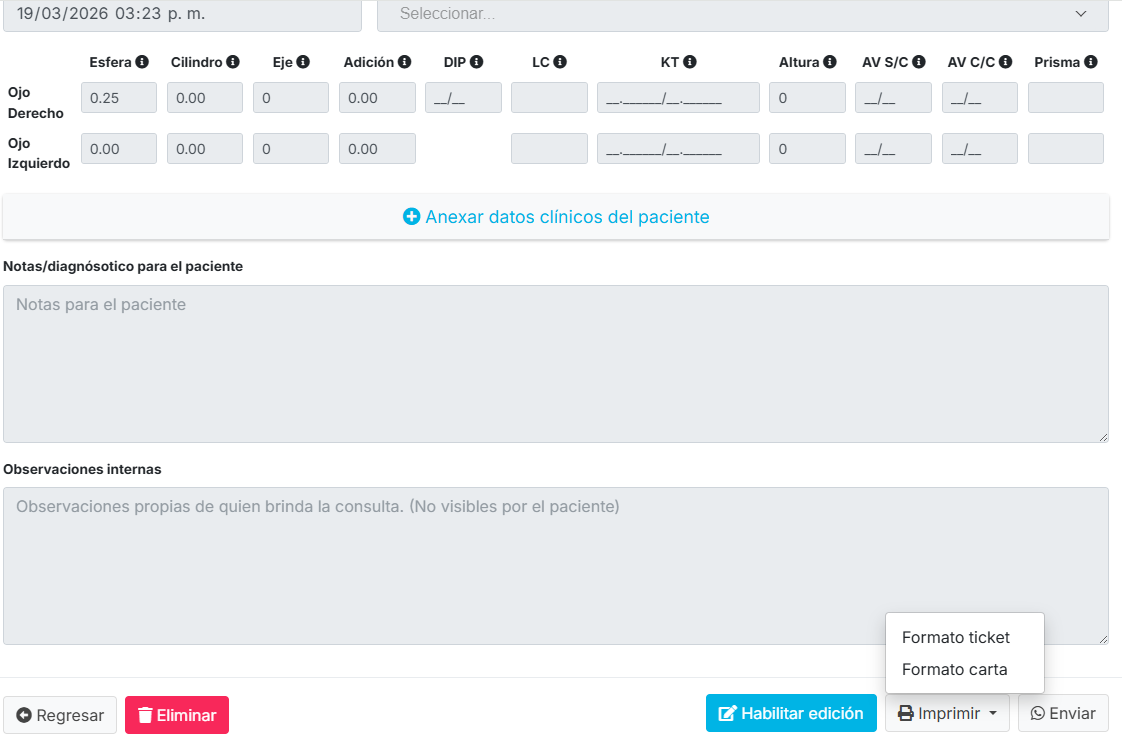 Podrá imprimir cualquier consulta las veces que considere necesarias. Deberá colocarse en el módulo de Expedientes y seleccionar el paciente. Después seleccionar la opción Historial de consultas. Posteriormente deberá seleccionar la consulta dando clic al botón Consultar registro. Deberá dar clic al botón Imprimir