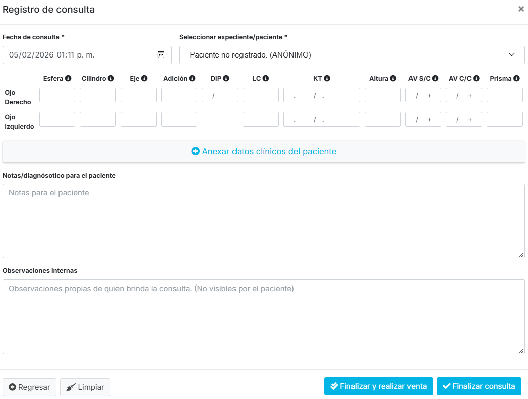 El sistema desplegará un formulario con todos los campos necesarios para registrar una nueva consulta médica, pero es necesario seleccionar al paciente o bien mantenerlo en anonimato. Al finalizar deberá presionar el botón Finalizar consulta o Finalizar y realizar venta para conservar los datos.