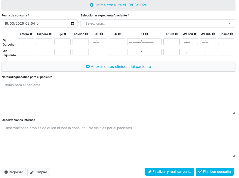 En automático aparecerá en el cuadro de contenido activo la nueva consulta para completarla, así como también visualizar la última consulta y Anexar datos clínicos del paciente. Al terminar dar clic al botón Finalizar consulta o Finalizar y realizar venta, donde se enviará directo al módulo de Ventas.