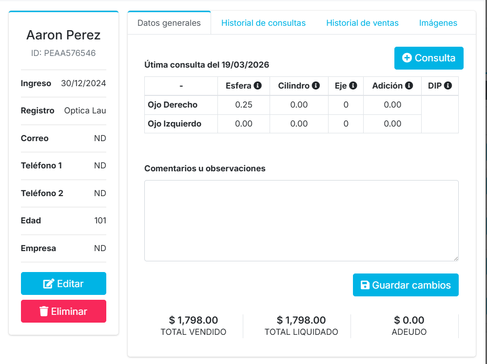 - Notas/Diagnóstico para el paciente. Es el espacio para poder incluir información adicional a los datos del examen de la vista. Esta información es obligatoria y aparecerá únicamente al momento de imprimir la receta o ticket del paciente.