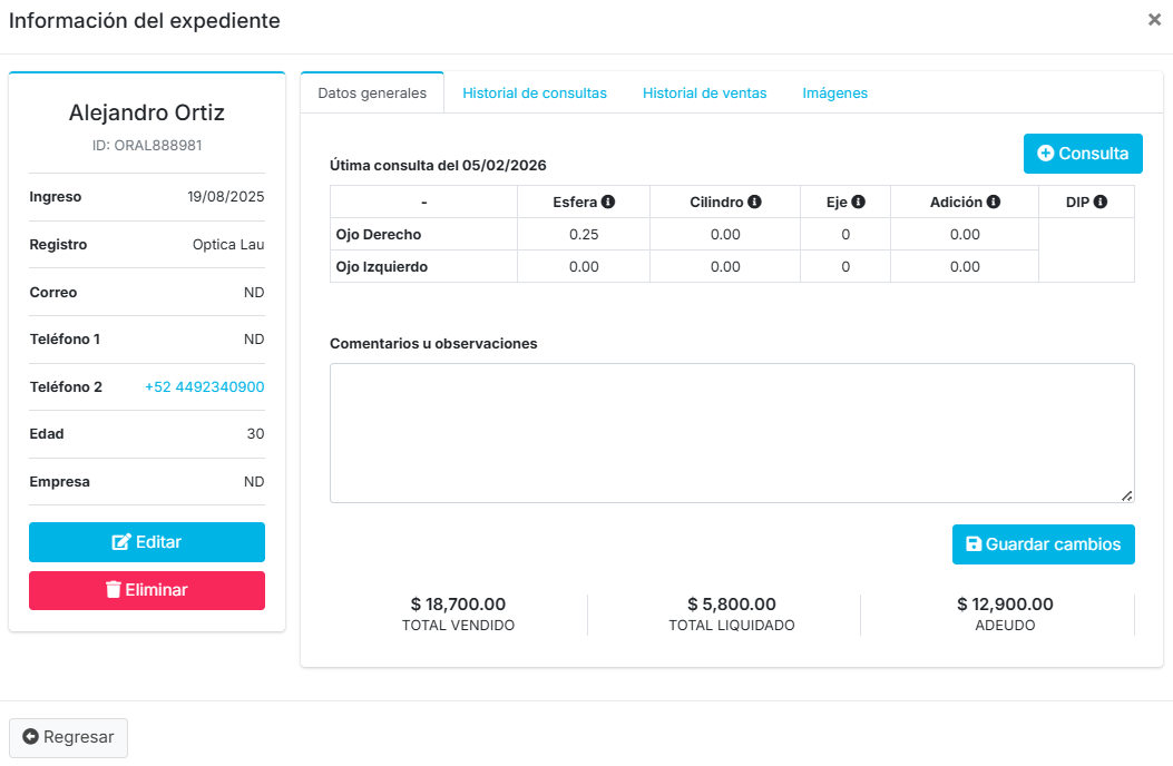 Para abrir un expediente y poder ver la información del paciente, deberá dar clic sobre el nombre del paciente que desea ver. El sistema mostrará la información del paciente, los datos de su último examen médico, así como su historial de consultas, ventas e imágenes.