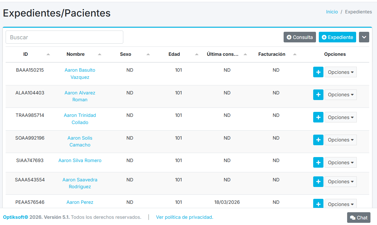 En la parte inferior se encontrará un resumen de la Fecha, Folio, Estatus, Total y Opciones del paciente.