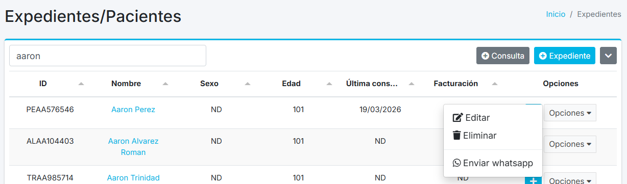 Para vincular un paciente a un cliente, se tiene que ir al módulo de Expedientes después dar clic al botón Opciones y al botón Editar.