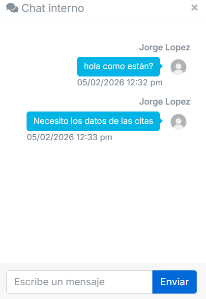 Este chat es únicamente para la comunicación entre los usuarios que tienen acceso al sistema. Es un chat para uso interno y se encuentra en la parte inferior del lado derecho.