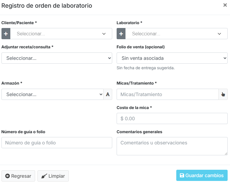 Al seleccionar un cliente, el sistema cargará automáticamente en el apartado Adjuntar receta/consulta la información más reciente correspondiente a ese cliente, si lo desea, podrá seleccionar una receta o consulta anterior. Asimismo, si el cliente cuenta con ventas asociadas, se mostrará por defecto la más reciente, con la opción de elegir alguna anterior o dejar sin venta asociada. En caso de seleccionar una venta asociada, en los apartados de Armazón y Micas/Tratamiento se mostrará una lista con los productos incluidos en dicha venta, para que pueda elegir el correspondiente. El sistema también permite capturar esta información de forma manual. Para cambiar entre la selección de productos y la captura manual, deberá hacer clic en el botón con ícono ubicado en esos campos.