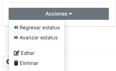 Para regresar de estatus deberá ubicar en el listado, el registro que usted desee, luego debe dar clic en el botón de Consultar , dentro del detalle, diríjase al botón Acciones, ubicado en la parte izquierda de la pantalla, seleccione la opción Regresar estatus.