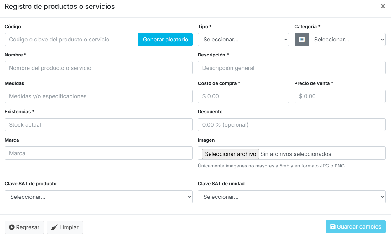 Para crear un nuevo producto, usted deberá dar clic al botón Nuevo, que se encuentra en la parte superior del Listado de productos y servicios. El sistema le desplegará el formulario para la captura de un nuevo producto o servicio. Al finalizar deberá dar clic al botón Guardar cambios.