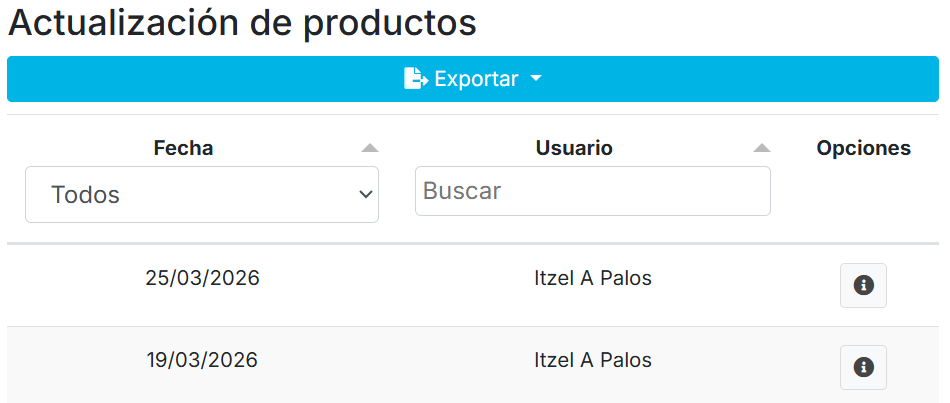 Esta opción le permitirá visualizar si se realizó una actualización de existencias y precios, al dar clic en el icono de Consultar , se mostrará una tabla con datos anteriores y los modificados. Contiene filtros para facilitar la búsqueda.