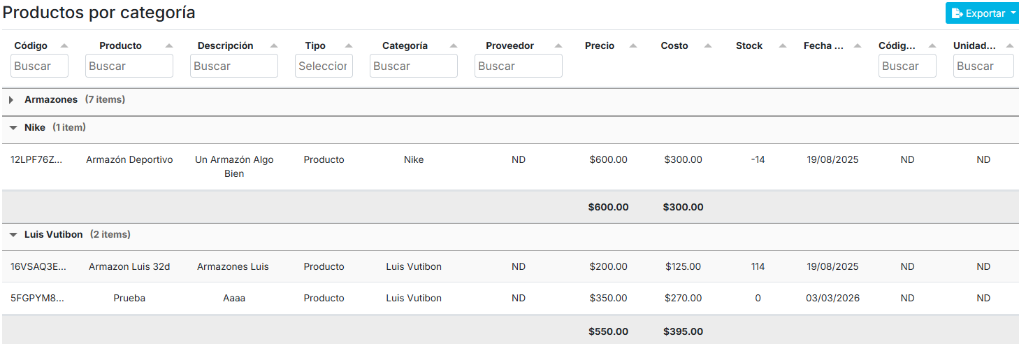 Esta opción muestra algunos detalles de los productos agrupados por las categorías existentes, incluye el número de productos dados de alta según la categoría. Al dar clic en el nombre de alguna categoría el sistema desplegará o esconderá el listado de los productos incluidos. Asimismo, se presenta una suma de los precios y otra de costos de los productos de la categoría.
