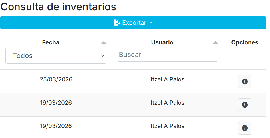 Esta opción le permitirá visualizar si se realizó una verificación de inventario, al dar clic en el icono de Consultar , se mostrará una tabla con los productos que se verificaron sus existencias, el stock anterior, el stock actual y si coincidieron o no las existencias. Contiene filtros para facilitar la búsqueda.