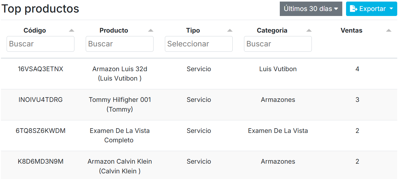 Esta opción le permitirá visualizar los productos que más se han vendido dentro del periodo seleccionado. De forma predeterminada, se muestran los últimos 30 días; sin embargo, el rango de fechas puede modificarse según se requiera.